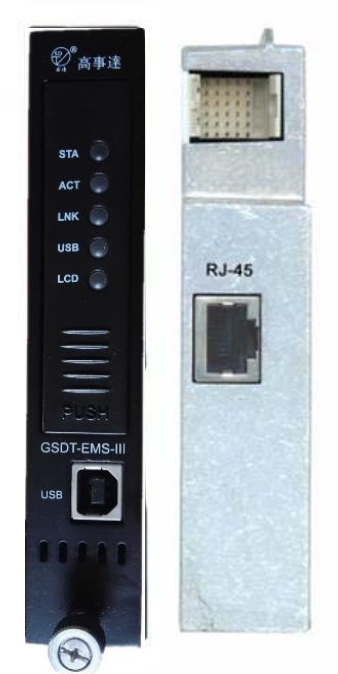 The GSDT-EMS-II equipment management module has high reliability, large Capacity, servesfor many kinds of communication modules. It is mounted in the first slot of the Excelsiorplatform to provide local monitoring and configuration, as well as remote management. TheGSDT-EMS module contains the strong function of DHCP Client. It is able to communicate with the rest of the modules via USB port for local access or RJ45 Ethernet port for remote access.The GSDT-EMS module provides NMCP (Network Management Console Program) for monitoring and configuration along with a PC compatible graphical user interface(GUI). The GSDT-EMS integrates the SNMP protocol and the SCTE-HMS-MIBs for remote access via a standard SNMP agent.